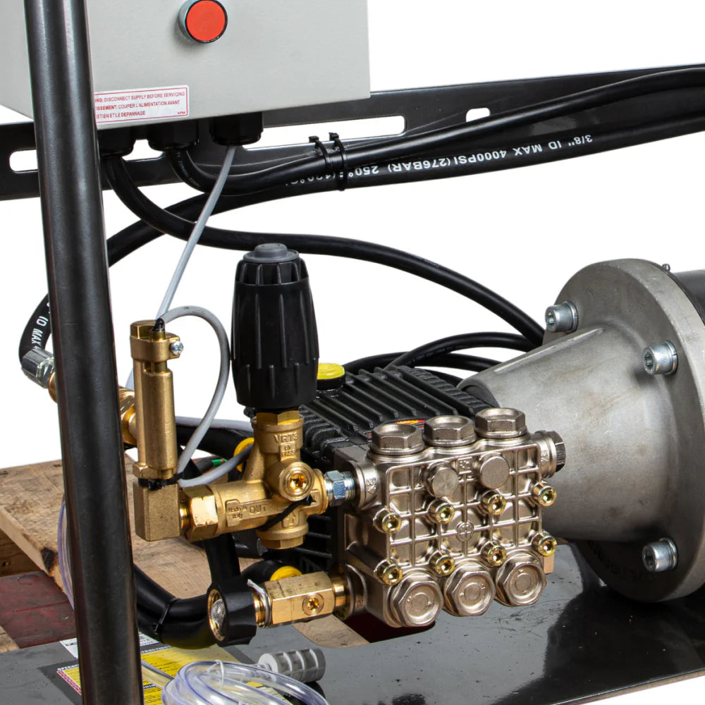 The X-2050FW1GENHT is a tough, high-performance electric pressure washer for fixed-installation commercial use that demands high volume and high temp water sources. 2,000 PSI at 4.0 GPM. 5.0 HP Baldor motor and General triplex plunger pump with specialized components to handle incoming water temp up to 85°C (185°F). A model designed for commercial use, the X-2050FW1GENHT stands out for durability and features.